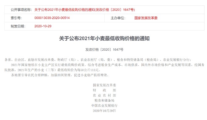 關(guān)于2021年小麥最低收購價(jià)有關(guān)政策的通知各省、自治區(qū)、直轄市發(fā)展改革委、糧食和物資儲備局(糧食局)、財(cái)政廳(局)、農(nóng)業(yè)農(nóng)村廳(局、委)、農(nóng)業(yè)發(fā)展銀行分行,中國儲備糧管理集團(tuán)有限公司、中糧集團(tuán)有限公司、中國供銷集團(tuán)有限公司、中國中化集團(tuán)有限公司:為保障國家糧食安全,進(jìn)一步完善糧食最低收購價(jià)政策,2021年繼續(xù)對最低收購價(jià)小麥限定收購總量?,F(xiàn)將具體事項(xiàng)通知如下。根據(jù)近幾年小麥最低收購價(jià)收購數(shù)量,限定2021年最低收購價(jià)小麥?zhǔn)召徔偭繛?700萬噸。(一)分批下達(dá)。限定收購總量分兩批次下達(dá),第一批數(shù)量為3330萬噸,不分配到?。坏诙鷶?shù)量為370萬噸,視收購需要具體分配到省。當(dāng)最低收購價(jià)全國收購總量達(dá)到第一批數(shù)量的90%時(shí),中儲糧有關(guān)分公司應(yīng)會同省級糧食等部門單位及時(shí)提出本省第二批收購的計(jì)劃數(shù)量建議。中儲糧集團(tuán)公司根據(jù)當(dāng)年小麥產(chǎn)量、收購量、農(nóng)戶余糧和市場價(jià)格等情況統(tǒng)籌平衡各省數(shù)量后,報(bào)國家糧食和物資儲備局批準(zhǔn)。國家糧食和物資儲備局通過政府網(wǎng)站公布各省第二批收購數(shù)量。在第一批收購?fù)瓿珊螅嘘P(guān)省份按照批準(zhǔn)的第二批數(shù)量繼續(xù)開展收購。當(dāng)收購量達(dá)到本省批準(zhǔn)數(shù)量時(shí),立即停止該省最低收購價(jià)收購且不再啟動。(二)動態(tài)監(jiān)測。啟動最低收購價(jià)執(zhí)行預(yù)案后,中儲糧集團(tuán)公司要嚴(yán)格按照預(yù)案有關(guān)規(guī)定,加強(qiáng)統(tǒng)計(jì)監(jiān)測,每五日向國家糧食和物資儲備局報(bào)送收購進(jìn)度;啟動第二批收購后,中儲糧集團(tuán)公司要按日報(bào)送收購進(jìn)度。國家糧食和物資儲備局定期通過政府網(wǎng)站公布最低收購價(jià)全國收購總量。省級糧食等有關(guān)部門要結(jié)合小麥商品量和農(nóng)戶余糧情況,及時(shí)開展調(diào)研調(diào)度,全面掌握收糧進(jìn)度。(一)認(rèn)真落實(shí)限量收購政策。中儲糧集團(tuán)公司作為最低收購價(jià)政策執(zhí)行主體,要嚴(yán)格執(zhí)行限定收購總量的收購政策,不得超量收購。財(cái)政資金支持限于最低收購價(jià)政策下的最高收購總量內(nèi)。(二)加強(qiáng)市場監(jiān)管。各地要認(rèn)真落實(shí)糧食收儲制度改革精神,規(guī)范糧食流通市場秩序,依法依規(guī)嚴(yán)厲查處糧食收儲過程中的違法違規(guī)行為。(三)促進(jìn)“優(yōu)糧優(yōu)價(jià)”。各地要積極鼓勵農(nóng)企對接,充分發(fā)揮市場價(jià)格對生產(chǎn)的反饋引導(dǎo)作用,促進(jìn)種植結(jié)構(gòu)調(diào)整優(yōu)化,增加綠色優(yōu)質(zhì)安全產(chǎn)品供給。