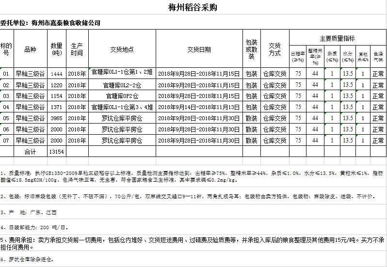 受客戶委托,梅州市嘉應(yīng)糧食交易中心有限公司定于2018年9月5日(星期三)舉辦糧食競價(jià)交易會(huì),梅州市嘉泰糧食收儲(chǔ)公司擬采購2018年早秈稻13154噸。