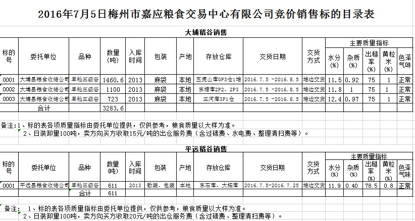 受客戶委托,梅州市嘉應(yīng)糧食交易中心有限公司定于2016年7月5日舉辦糧食競(jìng)價(jià)交易會(huì),大埔縣糧食收儲(chǔ)公司擬銷售2013年早秈稻谷3283.6噸,平遠(yuǎn)縣糧食收儲(chǔ)公司擬銷售2013年早秈稻谷611噸。