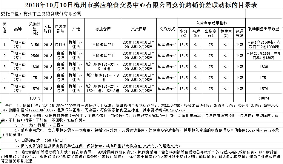 交易時間和地點:2018年10月10日(星期三)上午10時15分。廣東省梅州市彬芳大道南161號梅州市糧食交易中心3樓。
