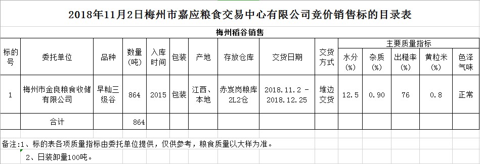 受客戶(hù)委托,梅州市嘉應(yīng)糧食交易中心有限公司定于2018年11月2日(星期五)舉辦糧食競(jìng)價(jià)交易會(huì),梅州市金良糧食收儲(chǔ)有限公司擬銷(xiāo)售2015年早秈稻864噸。