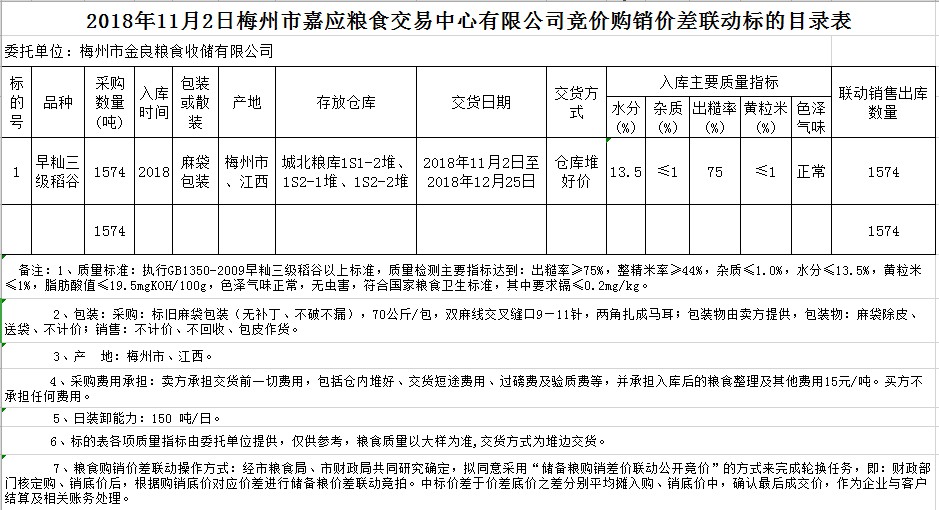受客戶委托,梅州市嘉應(yīng)糧食交易中心有限公司定于2018年11月2日(星期五)舉辦稻谷購銷價差聯(lián)動標的交易會,梅州市金良糧食收儲有限公司擬銷售和采購早秈稻1574噸。
