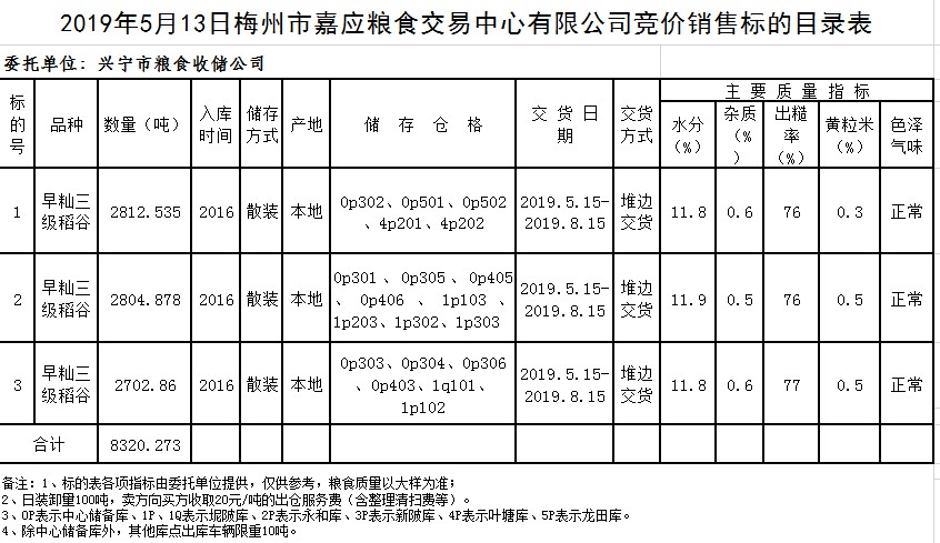 受客戶委托,梅州市嘉應(yīng)糧食交易中心有限公司定于2019年5月13日(星期一)舉辦糧食競(jìng)價(jià)交易會(huì),興寧市糧食收儲(chǔ)公司擬銷售2016年早秈稻8320.273噸。