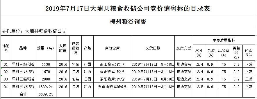 受客戶(hù)委托,梅州市嘉應(yīng)糧食交易中心有限公司定于2019年7月17日(星期三)舉辦糧食競(jìng)價(jià)交易會(huì),大埔縣糧食收儲(chǔ)公司擬銷(xiāo)售2016年早秈稻6639.24噸。