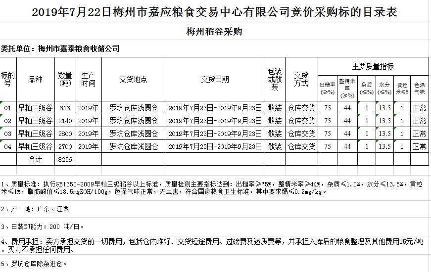 受客戶委托,梅州市嘉應(yīng)糧食交易中心有限公司定于2019年7月22日(星期一)舉辦糧食競價(jià)交易會(huì),梅州市嘉泰糧食收儲(chǔ)公司擬采購2019年早秈稻8256噸。