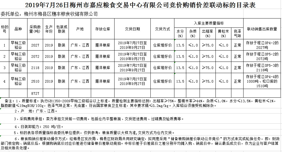 受客戶委托,梅州市嘉應(yīng)糧食交易中心有限公司定于2019年7月26日(星期五)舉辦稻谷購銷價(jià)差聯(lián)動(dòng)標(biāo)的交易會(huì),梅州市梅縣區(qū)穗豐糧食收儲(chǔ)有限公司擬銷售和采購早秈稻8727噸。