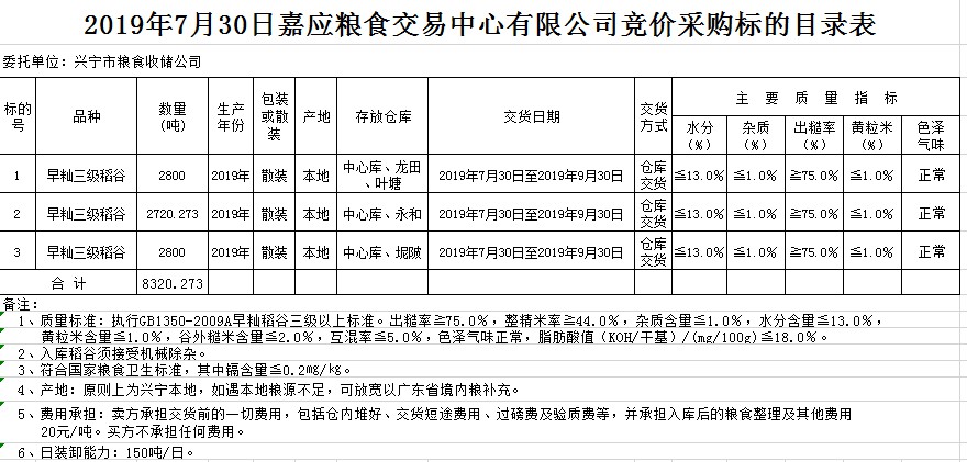 受客戶委托,梅州市嘉應(yīng)糧食交易中心有限公司定于2019年7月30日(星期二)舉辦糧食競價(jià)交易會(huì),興寧市糧食收儲公司擬采購2019年早秈稻8320.273噸。