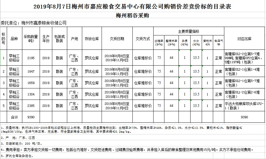受客戶(hù)委托,梅州市嘉應(yīng)糧食交易中心有限公司定于2019年8月7日(星期三)舉辦稻谷購(gòu)銷(xiāo)價(jià)差聯(lián)動(dòng)標(biāo)的交易會(huì),梅州市嘉泰糧食收儲(chǔ)公司擬銷(xiāo)售和采購(gòu)早秈稻9390噸。