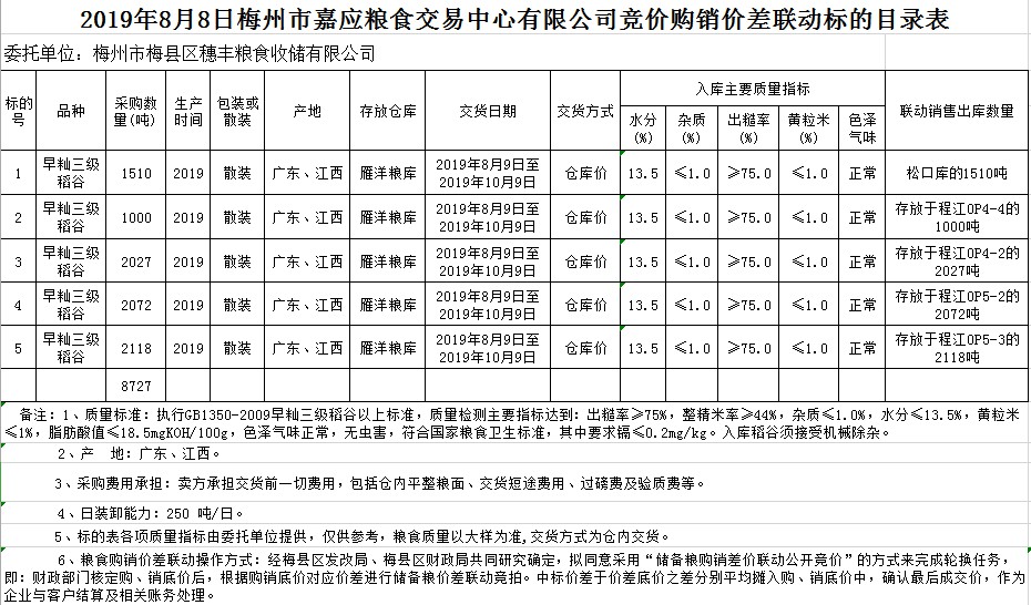 受客戶委托,梅州市嘉應(yīng)糧食交易中心有限公司定于2019年8月8日(星期四)舉辦稻谷購銷價差聯(lián)動標(biāo)的交易會,梅州市梅縣區(qū)穗豐糧食收儲有限公司擬銷售和采購早秈稻8727噸。