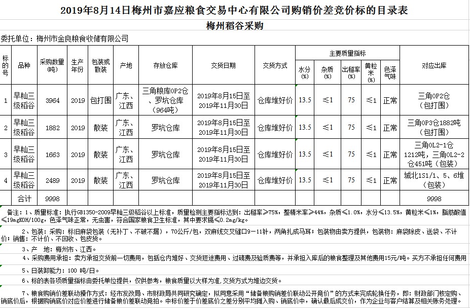 受客戶委托,梅州市嘉應(yīng)糧食交易中心有限公司定于2019年8月14日(星期三)舉辦稻谷購銷價差聯(lián)動標的交易會,梅州市金良糧食收儲有限公司擬銷售和采購早秈稻9998噸。