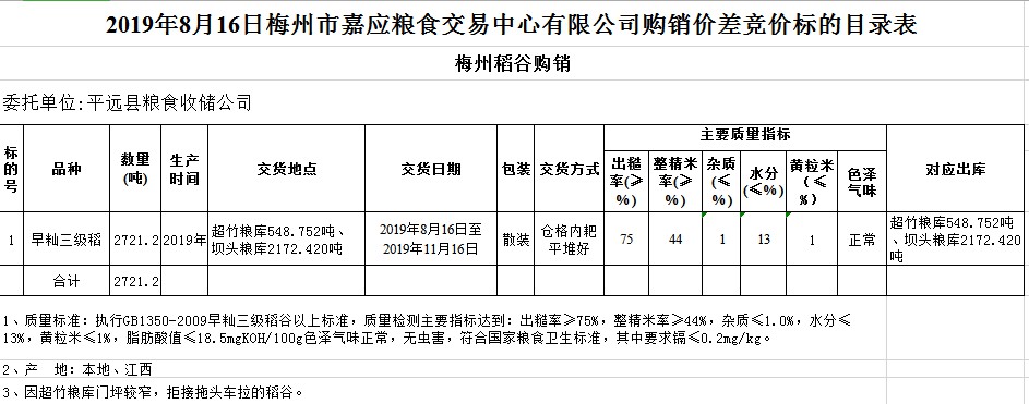 交易時間和地點:2019年8月16日(星期五)上午10時15分。廣東省梅州市彬芳大道南161號梅州市糧食交易中心3樓。