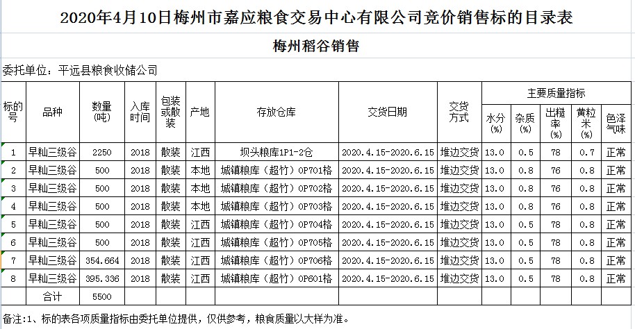 受客戶(hù)委托,梅州市嘉應(yīng)糧食交易中心有限公司定于2020年4月10日(星期五)舉辦糧食競(jìng)價(jià)交易會(huì),平遠(yuǎn)縣糧食收儲(chǔ)公司擬銷(xiāo)售2018年早秈稻5500噸。