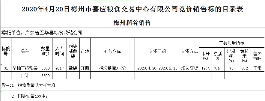 受客戶委托,梅州市嘉應(yīng)糧食交易中心有限公司定于2020年4月20日(星期一)舉辦糧食競價交易會,廣東省五華縣糧食收儲公司擬銷售2017年早秈稻3300噸。