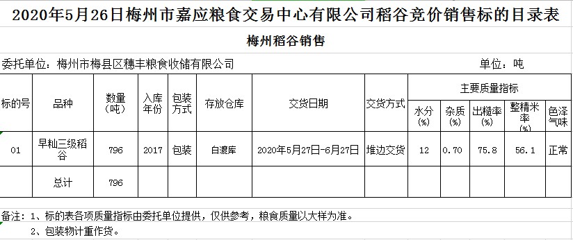 受客戶委托,梅州市嘉應糧食交易中心有限公司定于2020年5月26日(星期二)舉辦糧食競價交易會,梅州市梅縣區(qū)穗豐糧食收儲有限公司擬銷售2017年早秈稻796噸。