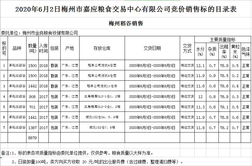 受客戶委托,梅州市嘉應(yīng)糧食交易中心有限公司定于2020年6月2日(星期二)舉辦糧食競價(jià)交易會(huì),梅州市金良糧食收儲(chǔ)有限公司擬銷售2017年、2018年早秈稻8879噸。