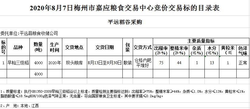 交易時間和地點(diǎn):2020年8月7日(星期五)上午10時。廣東省梅州市彬芳大道南161號梅州市糧食交易中心3樓。