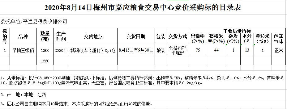 受客戶委托,梅州市嘉應(yīng)糧食交易中心有限公司定于2020年8月14日(星期五)舉辦糧食競(jìng)價(jià)交易會(huì),平遠(yuǎn)縣糧食收儲(chǔ)公司擬采購(gòu)2020年早秈稻1260噸。
