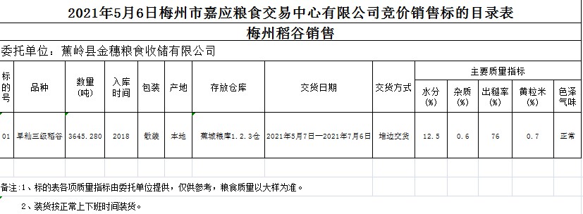 受客戶(hù)委托,梅州市嘉應(yīng)糧食交易中心有限公司定于2021年5月6日(星期四)舉辦糧食競(jìng)價(jià)交易會(huì)。蕉嶺縣金穗糧食收儲(chǔ)有限公司擬銷(xiāo)售2018年早秈稻3645.28噸。