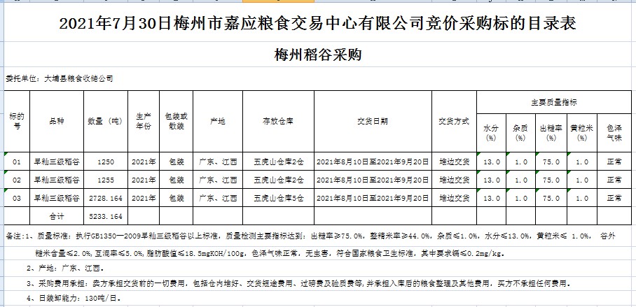 受客戶委托,梅州市嘉應(yīng)糧食交易中心有限公司定于2021年7月30日(星期五)舉辦糧食競(jìng)價(jià)交易會(huì)。大埔縣糧食收儲(chǔ)公司擬采購2021年早秈稻5233.164噸。
