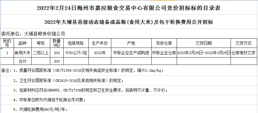 受客戶委托,梅州市嘉應糧食交易中心有限公司定于2022年2月24日(星期四)上午10時15分在廣東省梅州市彬芳大道南161號梅州市糧食交易中心3樓,舉辦大埔縣縣級動態(tài)儲備成品糧(食用大米)采購公開招標。