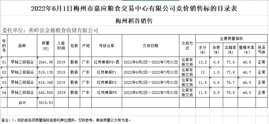受客戶委托,梅州市嘉應(yīng)糧食交易中心有限公司定于2022年6月1日(星期三)舉辦糧食競(jìng)價(jià)交易會(huì)。蕉嶺縣金穗糧食收儲(chǔ)有限公司擬銷(xiāo)售2019年早秈稻3819.93噸。