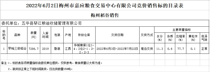 受客戶委托,梅州市嘉應(yīng)糧食交易中心有限公司定于2022年6月2日(星期四)舉辦糧食競價(jià)交易會(huì)。五華縣琴江糧油收儲(chǔ)管理有限公司擬銷售2019年早秈稻7286.7噸。