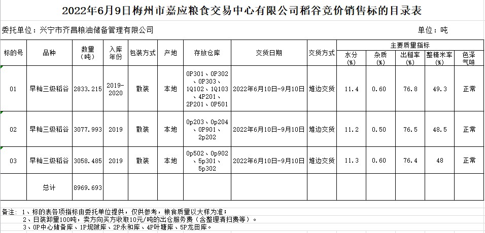 受客戶(hù)委托,梅州市嘉應(yīng)糧食交易中心有限公司定于2022年6月9日(星期四)舉辦糧食競(jìng)價(jià)交易會(huì)。興寧市齊昌糧油儲(chǔ)備管理有限公司擬銷(xiāo)售2019、2020年早秈稻8969.693噸。