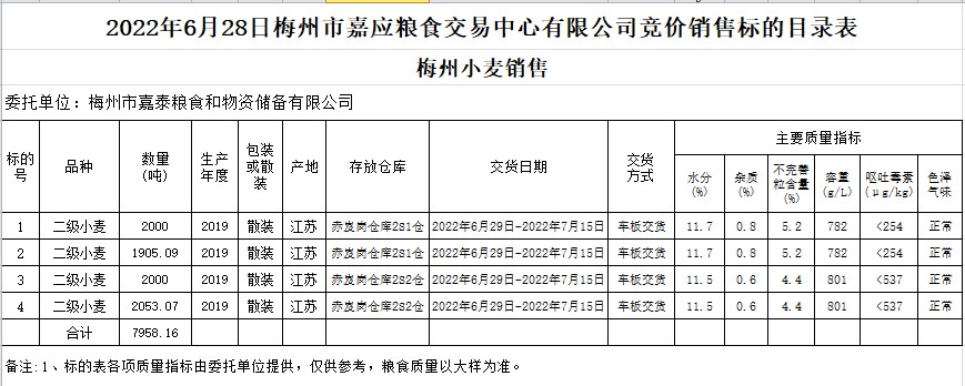 受客戶委托,梅州市嘉應(yīng)糧食交易中心有限公司定于2022年6月28日(星期二)舉辦糧食競價交易會。梅州市嘉泰糧食和物資儲備有限公司擬銷售2019年小麥7958.16噸。