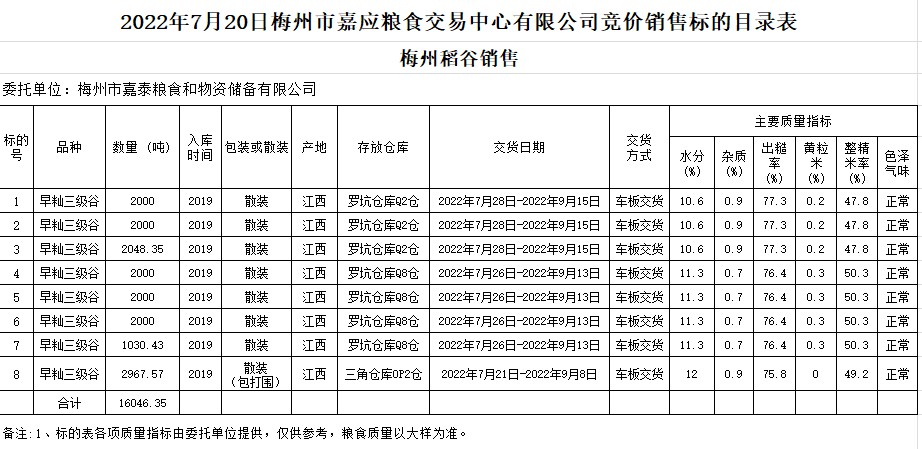 受客戶委托,梅州市嘉應糧食交易中心有限公司定于2022年7月20日(星期三)舉辦糧食競價交易會。梅州市嘉泰糧食和物資儲備有限公司擬銷售2019年早秈稻16046.35噸。