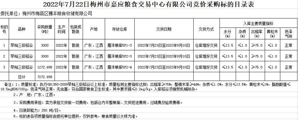 受客戶委托,梅州市嘉應(yīng)糧食交易中心有限公司定于2022年7月22日(星期五)舉辦糧食競價(jià)交易會(huì)。梅州市梅縣區(qū)穗豐糧食收儲(chǔ)有限公司擬采購2022年早秈稻7272.698噸。