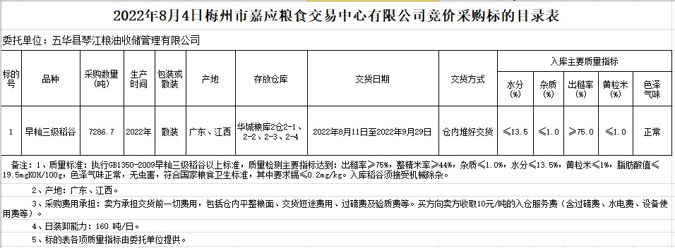 受客戶委托,梅州市嘉應(yīng)糧食交易中心有限公司定于2022年8月4日(星期四)舉辦糧食競(jìng)價(jià)交易會(huì)。五華縣琴江糧油收儲(chǔ)管理有限公司擬采購2022年早秈稻7286.7噸。