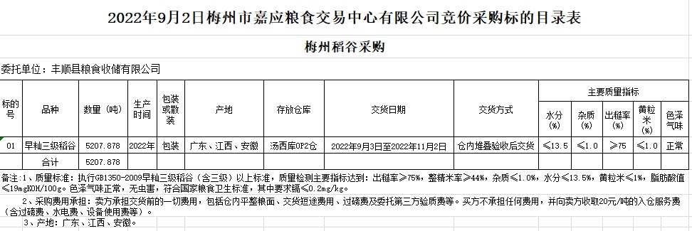 受客戶委托,梅州市嘉應(yīng)糧食交易中心有限公司定于2022年9月2日(星期五)舉辦糧食競(jìng)價(jià)交易會(huì)。豐順縣糧食收儲(chǔ)有限公司擬采購(gòu)2022年早秈稻5207.878噸。