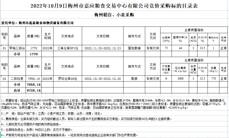 受客戶委托,梅州市嘉應(yīng)糧食交易中心有限公司定于2022年10月9日(星期日)舉辦糧食競價(jià)交易會。梅州市嘉泰糧食和物資儲備有限公司擬采購2022年早秈稻1770噸、二級白麥7958.16噸。