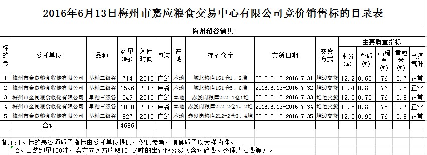 受客戶委托,梅州市嘉應(yīng)糧食交易中心有限公司定于2016年6月13日舉辦糧食競(jìng)價(jià)交易會(huì),梅州市金良糧食收儲(chǔ)有限公司擬銷售2013年早秈稻谷4686噸。