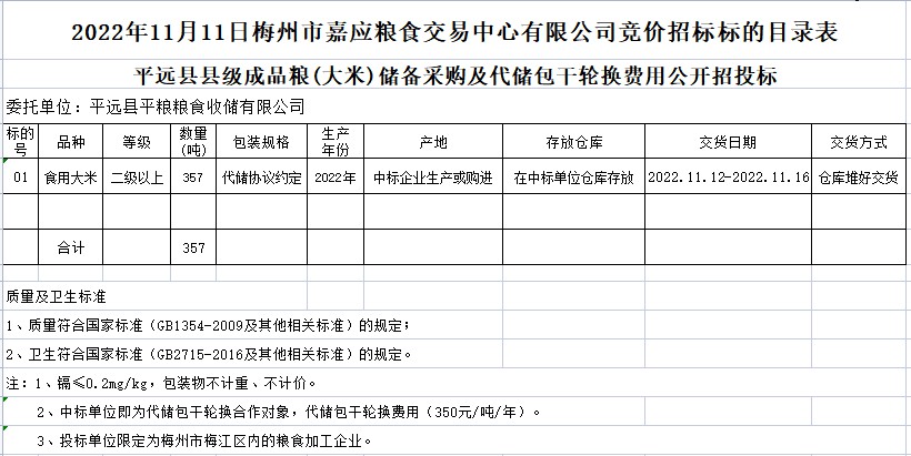 受客戶委托,梅州市嘉應(yīng)糧食交易中心有限公司定于2022年11月11日(星期五)上午10時(shí)在廣東省梅州市彬芳大道南161號(hào)梅州市糧食交易中心3樓,舉辦平遠(yuǎn)縣縣級(jí)儲(chǔ)備成品糧采購(gòu)公開招標(biāo)。
