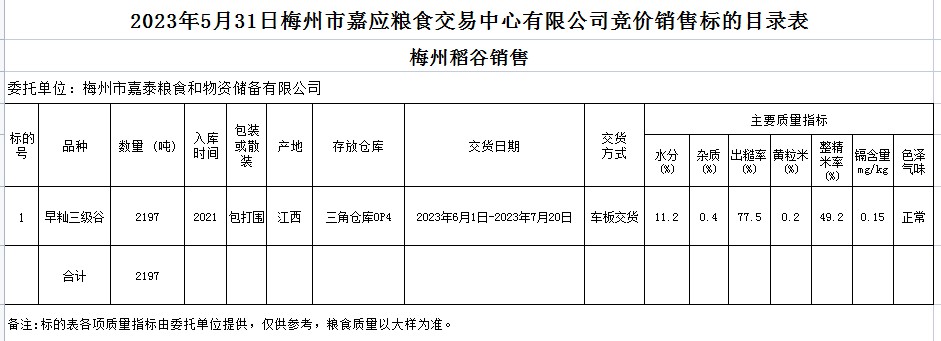 受客戶委托,梅州市嘉應糧食交易中心有限公司定于2023年5月31日(星期三)舉辦糧食競價交易會。梅州市嘉泰糧食和物資儲備有限公司擬銷售2021年早秈稻2197噸。