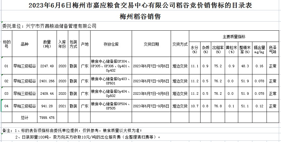 受客戶委托,梅州市嘉應(yīng)糧食交易中心有限公司定于2023年6月6日(星期二)舉辦糧食競(jìng)價(jià)交易會(huì)。興寧市齊昌糧油儲(chǔ)備管理有限公司擬銷(xiāo)售2020年、2021年早秈稻7999.476噸。