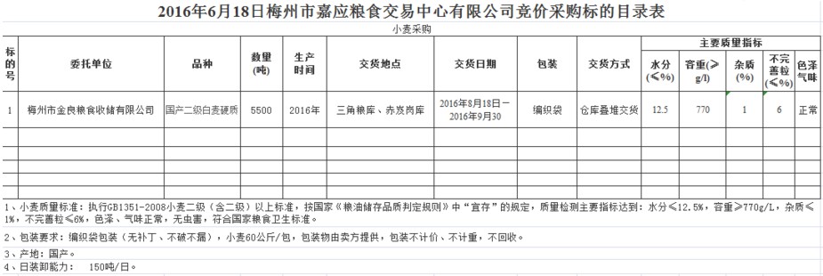 受客戶委托,梅州市嘉應(yīng)糧食交易中心有限公司定于2016年8月18日舉辦糧食競價(jià)交易會(huì),梅州市金良糧食收儲(chǔ)有限公司擬采購2016年產(chǎn)二級(jí)硬質(zhì)小麥5500噸。