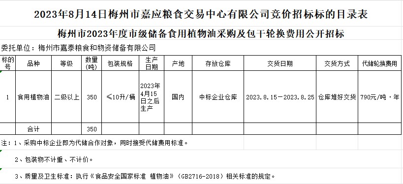 受梅州市嘉泰糧食和物資儲(chǔ)備有限公司委托,梅州市嘉應(yīng)糧食交易中心有限公司定于2023年8月14日(星期一)上午10時(shí)15分舉辦梅州市市級儲(chǔ)備食用植物油采購及包干輪換費(fèi)用公開招標(biāo)。