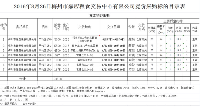 受客戶委托,梅州市嘉泰糧食收儲公司擬采購2016年產(chǎn)早秈三級稻谷24318噸。