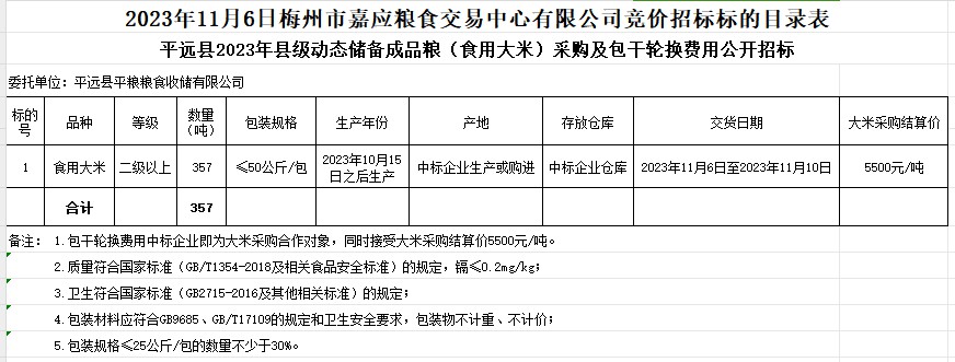 受客戶委托,梅州市嘉應(yīng)糧食交易中心有限公司定于2023年11月6日(星期一)上午10時(shí)在廣東省梅州市彬芳大道南161號(hào)梅州市糧食交易中心3樓,舉辦平遠(yuǎn)縣2023年縣級(jí)動(dòng)態(tài)儲(chǔ)備成品糧(食用大米)采購及包干輪換費(fèi)用公開招標(biāo)。