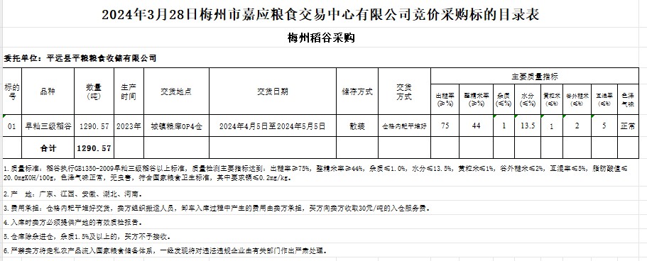 受客戶委托,梅州市嘉應糧食交易中心有限公司定于2024年3月28日(星期四)舉辦糧食競價交易會。平遠縣平糧糧食收儲有限公司擬采購2023年產(chǎn)早秈稻1290.57噸。