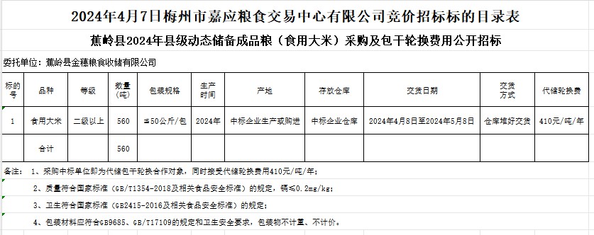 蕉嶺縣2024年縣級動態(tài)儲備成品糧(食用大米)采購及包干輪換費用公開招標公告