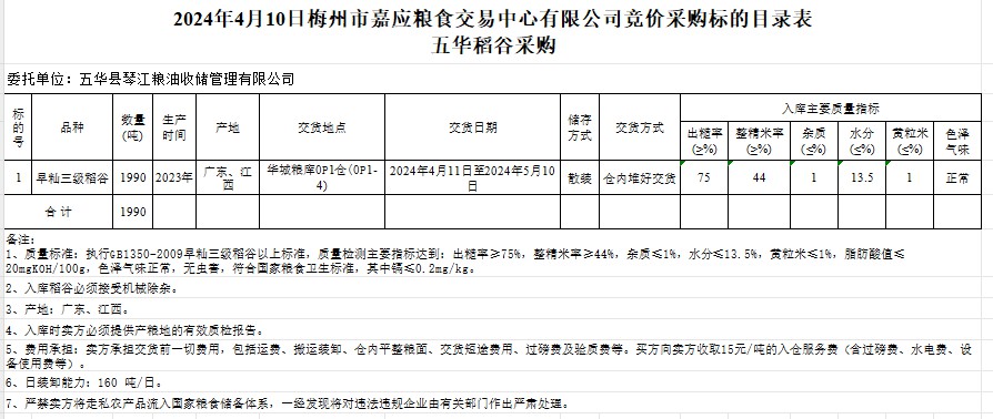 受客戶(hù)委托,梅州市嘉應(yīng)糧食交易中心有限公司定于2024年4月10日(星期三)舉辦糧食競(jìng)價(jià)交易會(huì)。五華縣琴江糧油收儲(chǔ)管理有限公司擬采購(gòu)2023年產(chǎn)早秈稻1990噸。