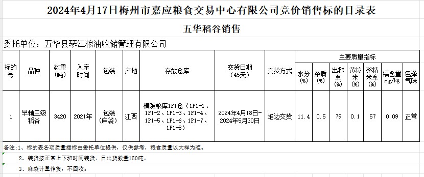 受客戶委托,梅州市嘉應(yīng)糧食交易中心有限公司定于2024年4月17日(星期三)舉辦糧食競(jìng)價(jià)交易會(huì)。五華縣琴江糧油收儲(chǔ)管理有限公司擬銷售2021年產(chǎn)早秈稻3420噸。
