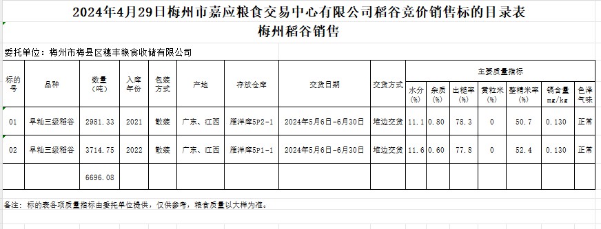 受客戶委托,梅州市嘉應(yīng)糧食交易中心有限公司定于2024年4月29日(星期一)舉辦糧食競(jìng)價(jià)交易會(huì)。梅州市梅縣區(qū)穗豐糧食收儲(chǔ)有限公司擬銷售2021年、2022年產(chǎn)早秈稻6696.08噸。
