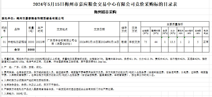 受客戶委托,梅州市嘉應糧食交易中心有限公司定于2024年5月15日(星期三)舉辦糧食競價交易會。梅州市嘉泰糧食和物資儲備有限公司擬采購2023年產中晚秈稻谷8000噸。