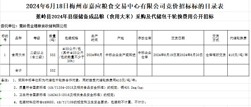 蕉嶺縣2024年縣級儲備成品糧(食用大米)采購及代儲包干輪換費(fèi)用公開招標(biāo)公告