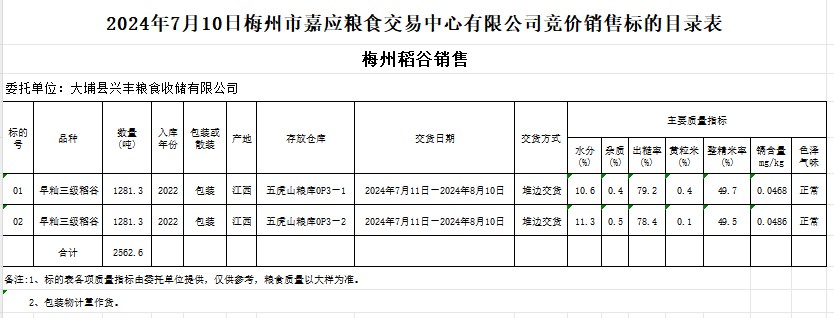 受客戶委托,梅州市嘉應(yīng)糧食交易中心有限公司定于2024年7月10日(星期三)舉辦糧食競價交易會。大埔縣興豐糧食收儲有限公司擬銷售2022年產(chǎn)早秈稻谷2562.6噸。