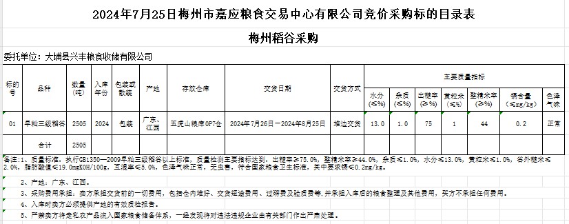 受客戶委托,梅州市嘉應(yīng)糧食交易中心有限公司定于2024年7月25日(星期四)舉辦糧食競(jìng)價(jià)交易會(huì)。大埔縣興豐糧食收儲(chǔ)有限公司擬采購2024年產(chǎn)早秈稻谷2505噸。